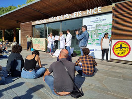 À Nice, une conférence-occupation festive et populaire s’est tenue sur le thème « Urgence climatique, inaction politique », devant la Maison des Grands Projets de la Ville de Nice, pour dénoncer notamment l’extension du terminal 2 de l’aéroport et l’urbanisation massive de terres fertiles dans la plaine du Var. Une banderole « Climat, biodiversité : écoutons les scientifiques » a été déployée.