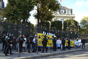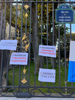 Le 10 novembre 2022, une trentaine de scientifiques ont manifesté devant le siège de Dassault Aviation, troisième fabricant mondial de jets privés avec les fameux Falcon, sur le Rond-Point des Champs-Élysées dans le 8e arrondissement de Paris, pour dénoncer l’impact climatique des jets privés. Cette action visait à défendre les revendications de la campagne internationale Make Them Pay menée simultanément dans 11 pays : interdire les jets privés ; taxer les grands voleurs ; faire payer les ultrariches pollueurs. Les participant·es ont recouvert les grilles dorées de l’hôtel particulier abritant le siège du groupe Dassault de reproductions d’articles scientifiques traitant de l’impact environnemental de l’aviation et lancé ces articles sous forme d’avions en papier.