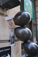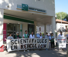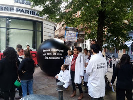 À Nice, Toulouse, Paris, Blois, Nancy, Tours, Montpellier et Metz, scientifiques et militants étaient réuni·es autour d’actions communes. À Blois, la façade de l’agence BNP a été aspergée de peinture. À Nice, un distributeur de billets a été neutralisé par de la peinture noire, et la façade recouverte de tracts. À Toulouse, une bombe factice de deux mètres de diamètre sur laquelle était inscrit « bombes climatiques, qui sont les éco-terroristes ?? » a été posée et allumée devant deux agences BNP. À Paris, la vitrine d’une agence a été recouverte d’articles scientifiques en lien avec les émissions des énergies fossiles, et des tracts ont été distribués aux passants et clients. À Nancy l’une des agences a été investie pour diffuser des tracts. A Tours, les façades et distributeurs de plusieurs agences ont été aspergés de ont liquide visqueux et noir simulant le pétrole.