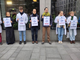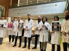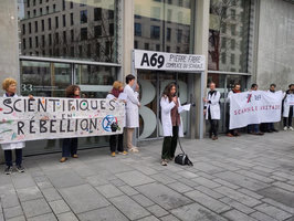 Des membres du collectif Scientifiques en rébellion, des membres d’Extinction Rébellion et des soignant·es ont exhorté le groupe pharmaceutique Pierre Fabre à cesser son lobbying en faveur de la construction de l’autoroute A69 entre Toulouse et Castres, et à prendre position en faveur d’un moratoire sur les travaux. En attendant cette déclaration publique, les participant·es ont relayé un appel au boycott sur les produits dermo-cosmétiques du groupe, notamment sa marque-phare Avène. Une lettre à l'attention de la direction du groupe a été remise expliquant pourquoi il faut renoncer à cette nouvelle autoroute.