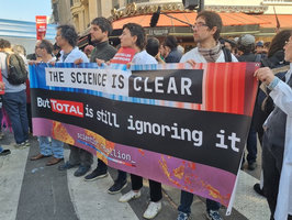 Plusieurs scientifiques ont participé au blocage de l’Assemblée générale de Total le 26 mai à Paris. Cette action était organisée par Alternatiba Paris, les Amis de la Terre France, Attac, et avec le soutien de Greenpeace France, 350.org, et bien sûr Scientifiques en rébellion. Elle faisait suite à une tribune que nous avions co-signée qui annonçait que « l’Assemblée générale de Total n’aura[it] pas lieu ». Malgré la répression policière dès le petit matin (gaz lacrymogènes notamment), 700 activistes ont fortement perturbé la tenue de cette assemblée. Plusieurs d’entre nous ont pris la parole et contribué à légitimer les revendications. En ligne, nous avons participé à la Twitter Storm organisée par Alternatiba : le mots-clé #BlocageTotal est a occupé le haut de l’affiche pendant les 2h de l’action, avec plus de 45 000 tweets.