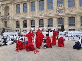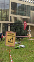 L’action en deux groupes simultanés a occupé tout l’espace de ce site emblématique et rayonnant à l’international. Tandis que des slogans étaient scandés et des tracts distribués sur le parvis, un pipeline et son puits de forage étaient creusés de l’autre côté du bâtiment. Le premier groupe a réalisé un die-in pendant que l’autre terminait d’installer un derrick, représentatif de l’industrie pétrolière. Le site a aussi été décoré de pancartes résumant ce qu’implique le projet EACOP : « violation des droits humains », « destruction des écosystèmes », « 118 000 habitant·es exproprié·es »…